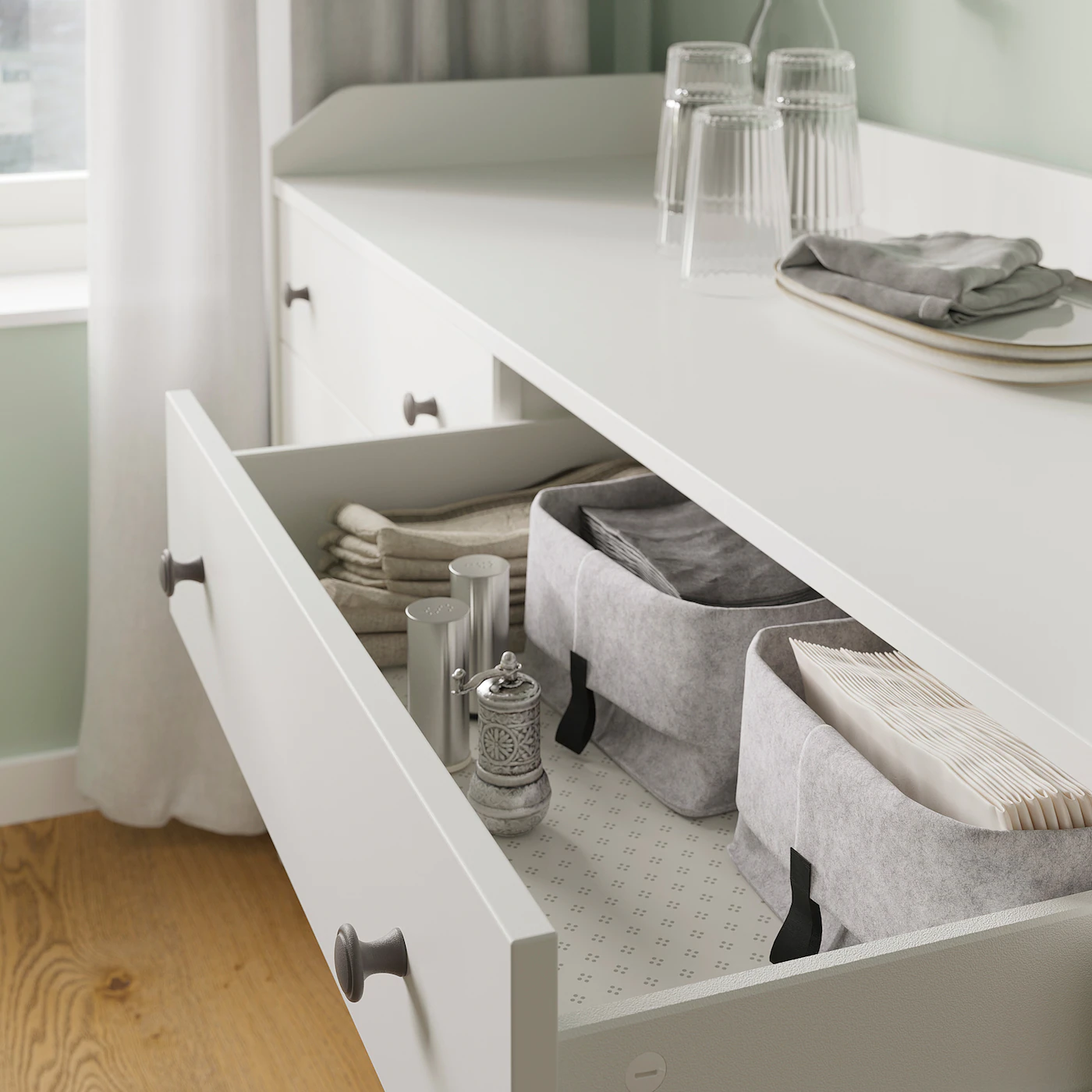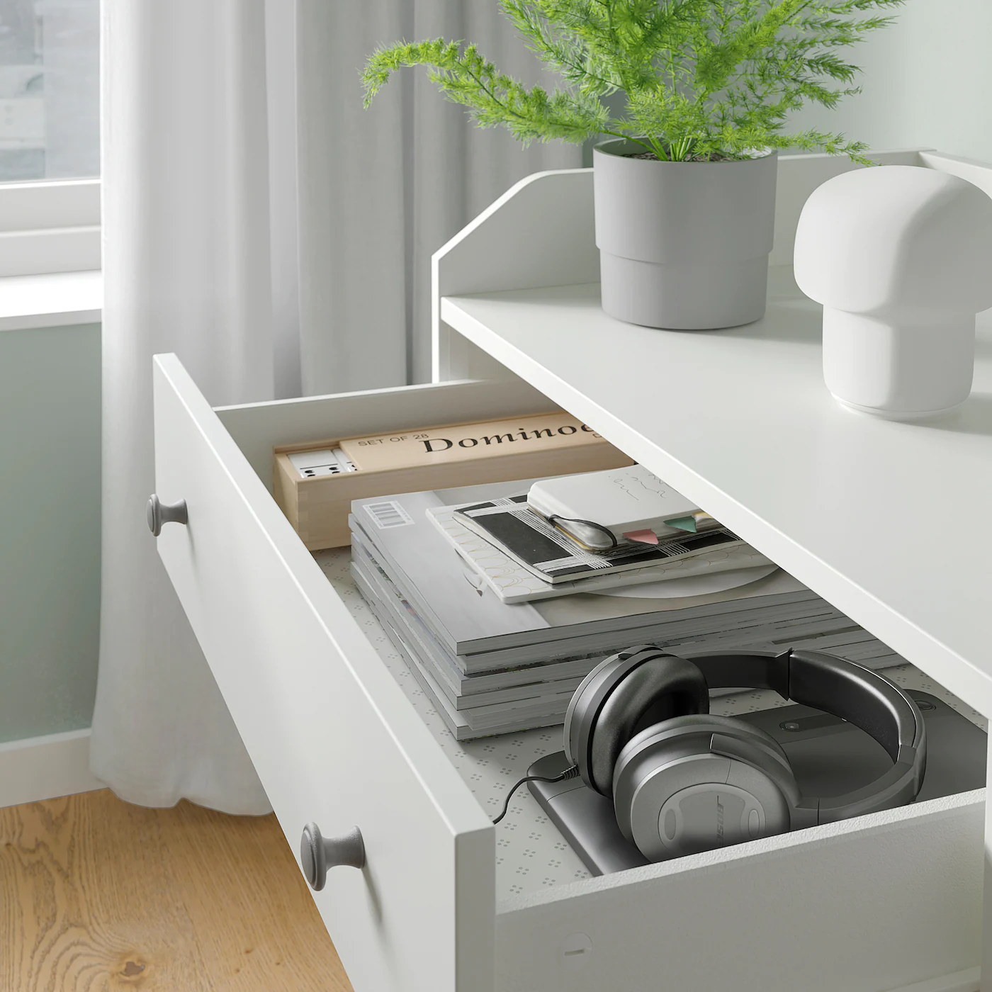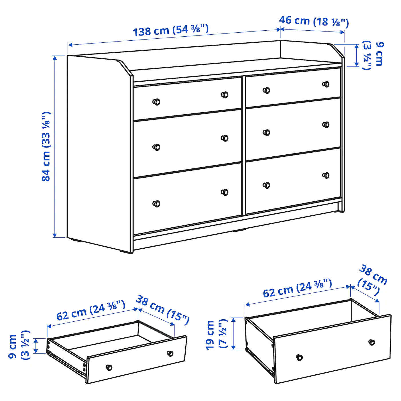 Designed to be used both on its own throughout the home and is also a perfect fit with other furniture in the HAUGA series, either to coordinate the style or create bigger storage solutions. Thanks to the distinctive look and smart design, furniture in the HAUGA series works well on their own and even better together. The flat, smooth sides create seamless units when pieces are placed next to each other. A versatile piece of furniture that you can use in many different rooms in the home. Maximize your storage and create a coordinated look by building your own HAUGA storage combination. The characteristic top shelf is a common feature in the entire HAUGA series and adds to the traditional style. Regardless if you use it for hats, boxes, or decorations, the edge keeps your things in place. A wide chest of drawers gives you plenty of storage space as well as room for lamps or other items you want to display on top. If you want to organize inside, you can complement with interior accessories from the STUK series. The frame is easy to assemble thanks to the construction with a wedge dowel that easily clicks into the pre-drilled holes.Material