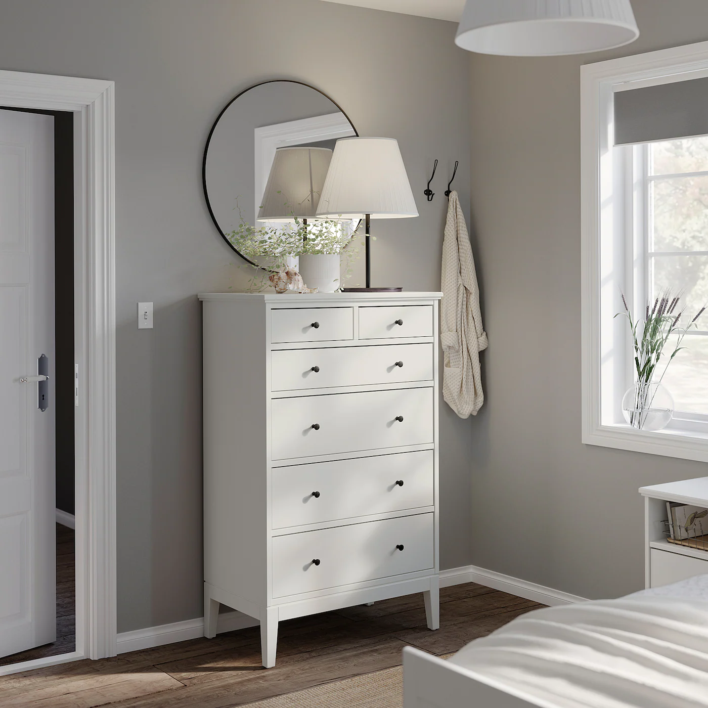 This high chest gives you plenty of storage without taking up too much room. The drawers close silently and softly, thanks to the integrated soft-closing function. The innovative, folding construction helps you to assemble the drawers quickly and easily. The assembly of this product is simplified thanks to the wedge dowel that clicks into pre-drilled holes.Material