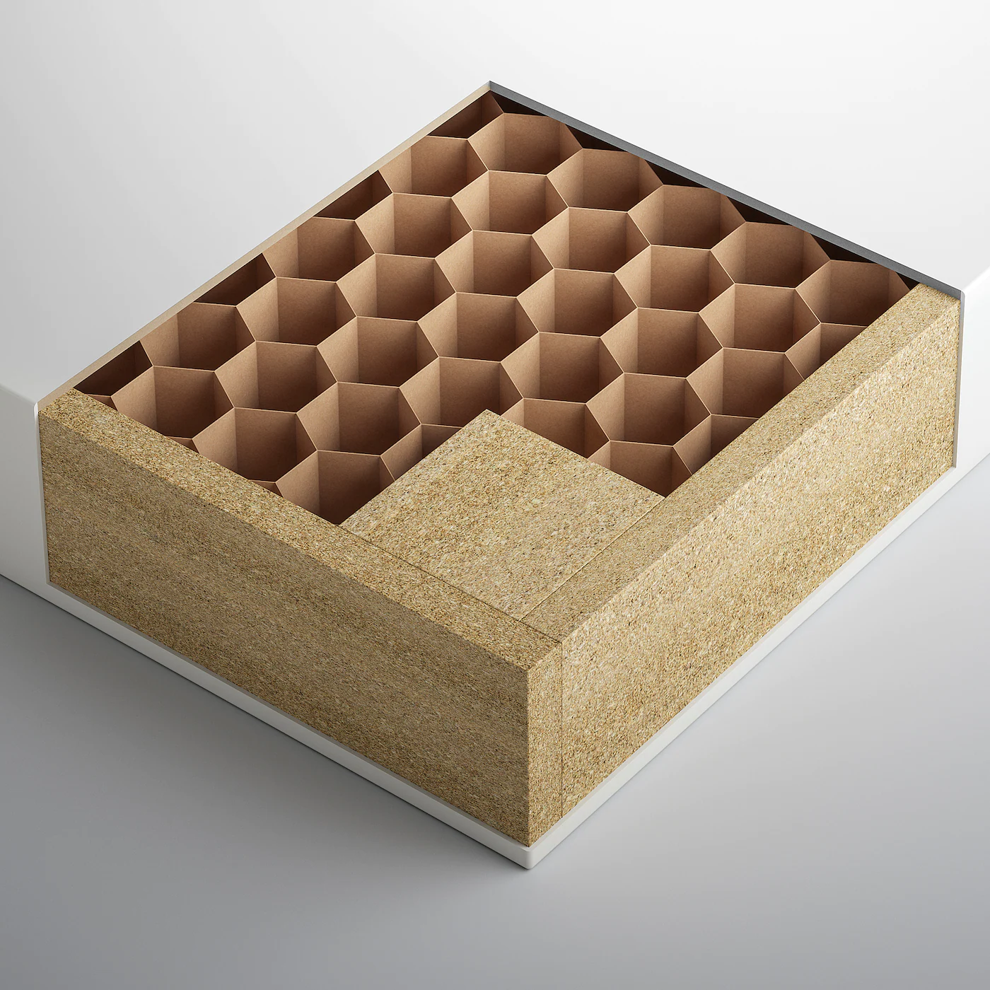 Top:Particleboard, Honeycomb structure paper filling (100% recycled), Fiberboard, Acrylic paint, Plastic edging