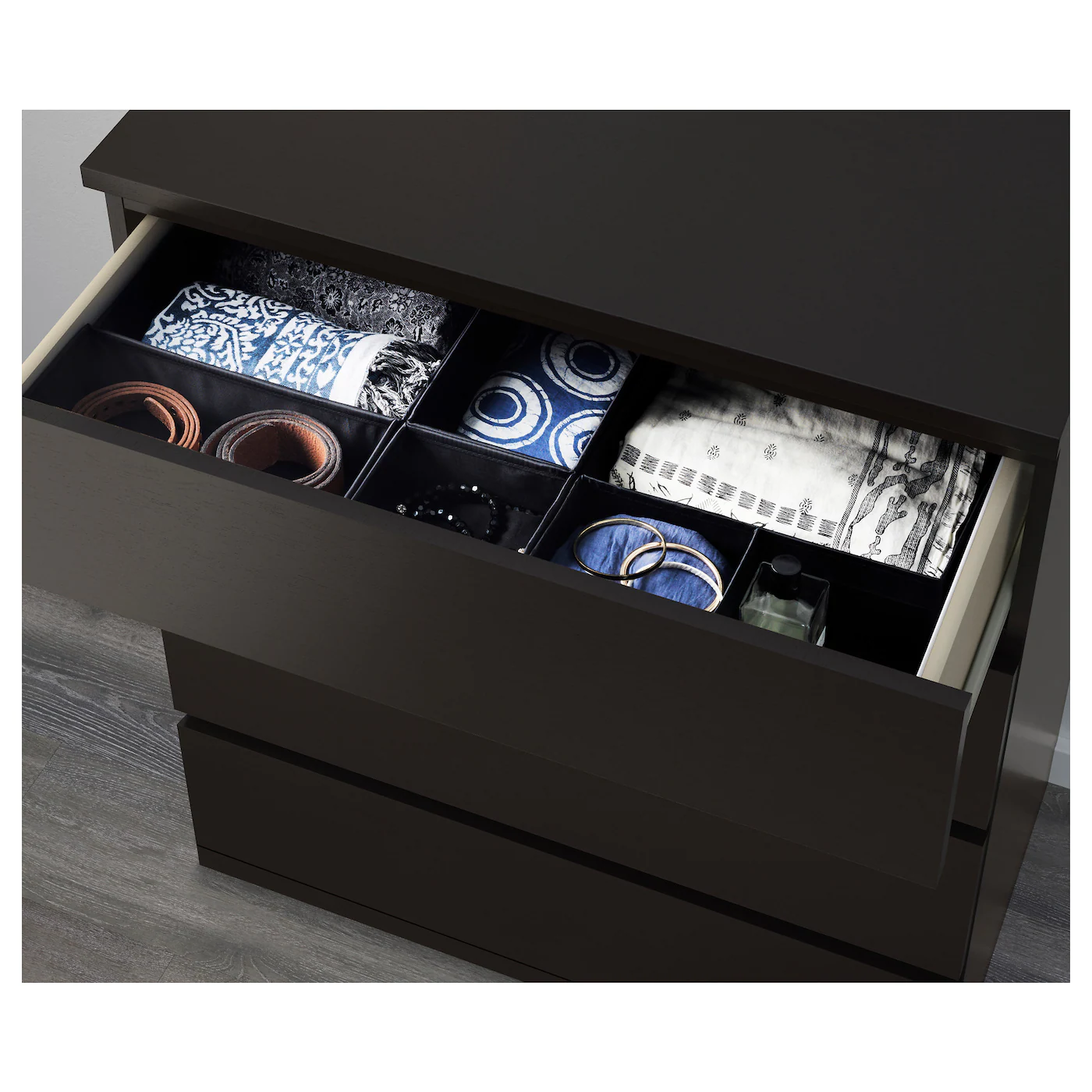 Real wood veneer will make this chest of drawers age gracefully. Smooth running drawers with pull-out stop. If you want to organize inside you can complement with SKUBB box, set of 6.Material
