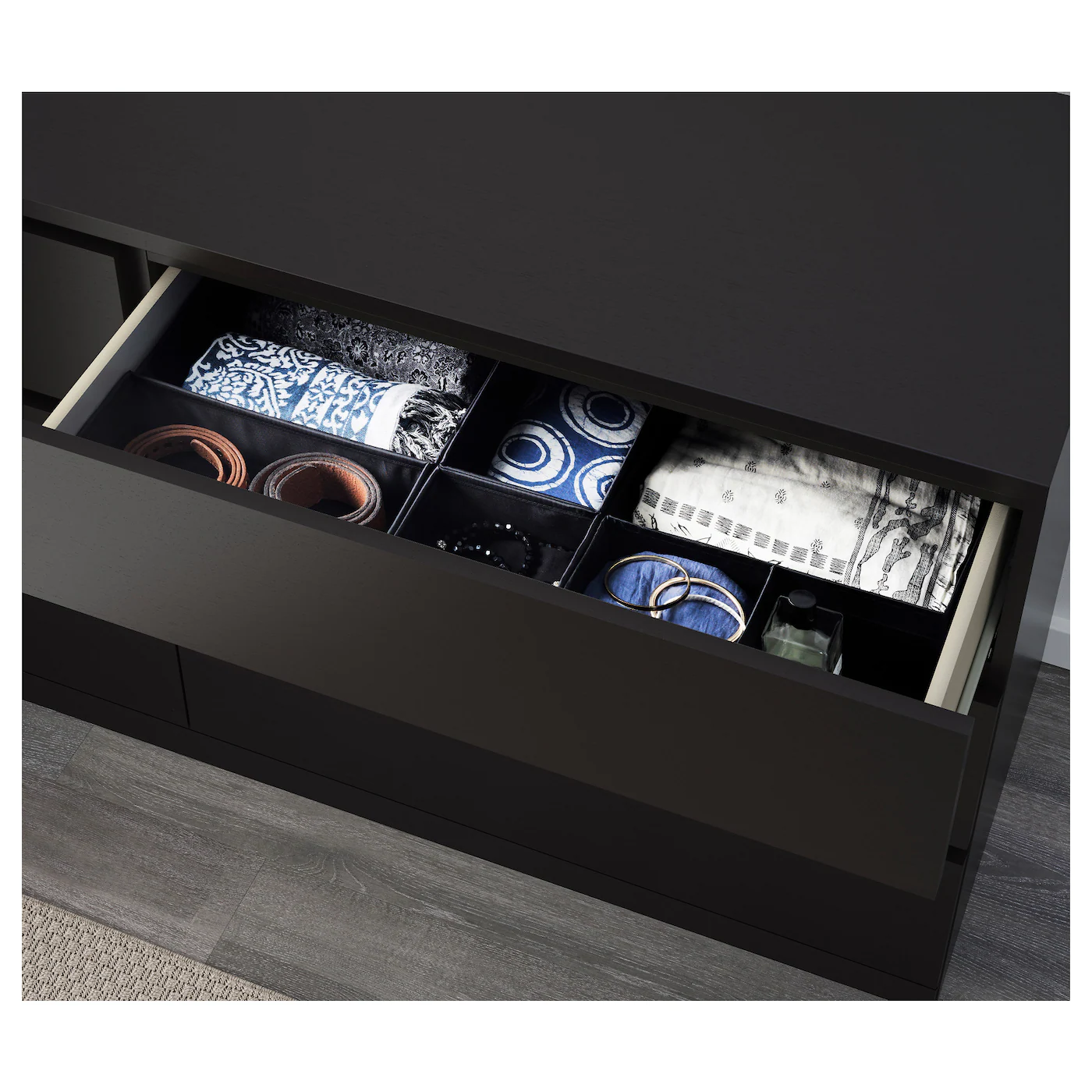 A wide chest of drawers gives you plenty of storage space as well as room for lamps or other items you want to display on top. Real wood veneer will make this chest of drawers age gracefully. Smooth running drawers with pull-out stop. If you want to organize inside you can complement with SKUBB box, set of 6.Material