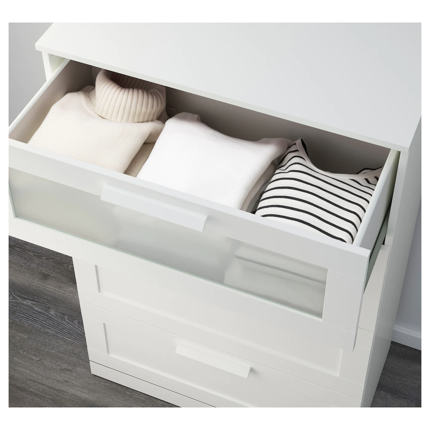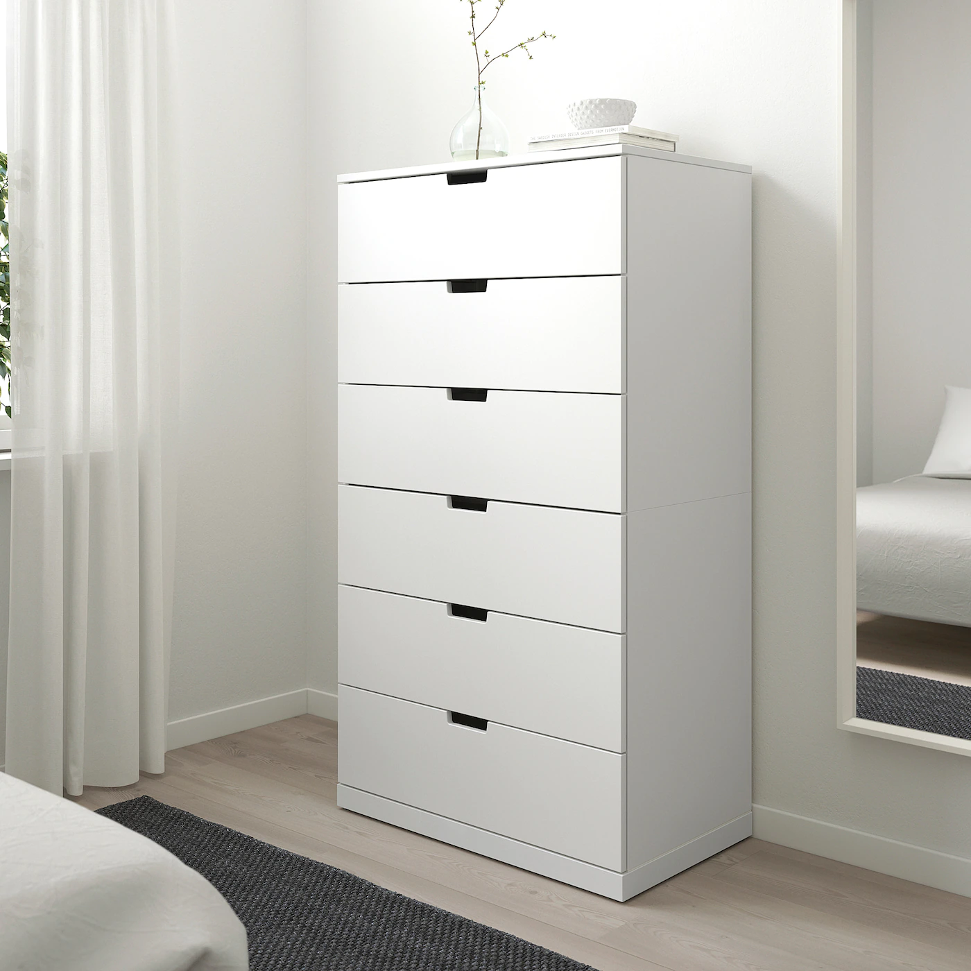 A wide chest of drawers gives you plenty of storage space as well as room for lamps or other items you want to display on top. Real wood veneer will make this chest of drawers age gracefully. Smooth running drawers with pull-out stop. If you want to organize inside you can complement with SKUBB box, set of 6.Material