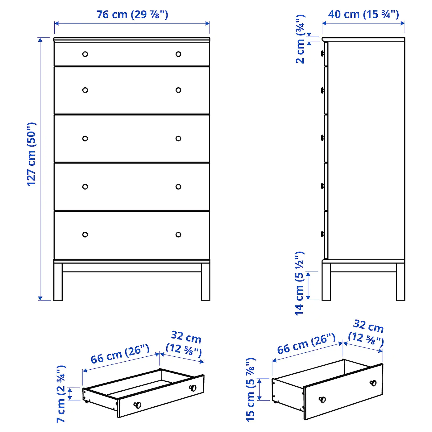 Made of solid wood, which is a durable and warm natural material. If you oil, wax, lacquer or stain the untreated solid wood surface it will be more durable and easy to care for. This high chest gives you plenty of storage without taking up too much room. Smooth running drawer with pull-out stop. If you want to organize inside you can complement with SKUBB box, set of 6.Material
